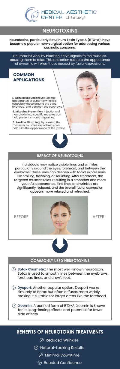 At the Medical Aesthetic Center of Georgia, we offer advanced injectable treatments—neurotoxins and fillers—to help our patients achieve natural looking, refreshed results. Both neurotoxins and fillers are highly popular in the field of aesthetic medicine, but each addresses unique concerns and works through different mechanisms.